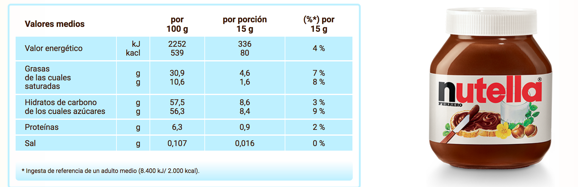 Y aquí viene el primer inconveniente. En la Nutella no se especifican las cantidades de algunos ingredientes. ¡Normal, no nos van a dar la fórmula secreta! Para tener una idea de las cantidades que nos faltan, hay que mirar la tabla nutricional, intentar sacar conclusiones o, si no, hacer una estimación por sentido común: